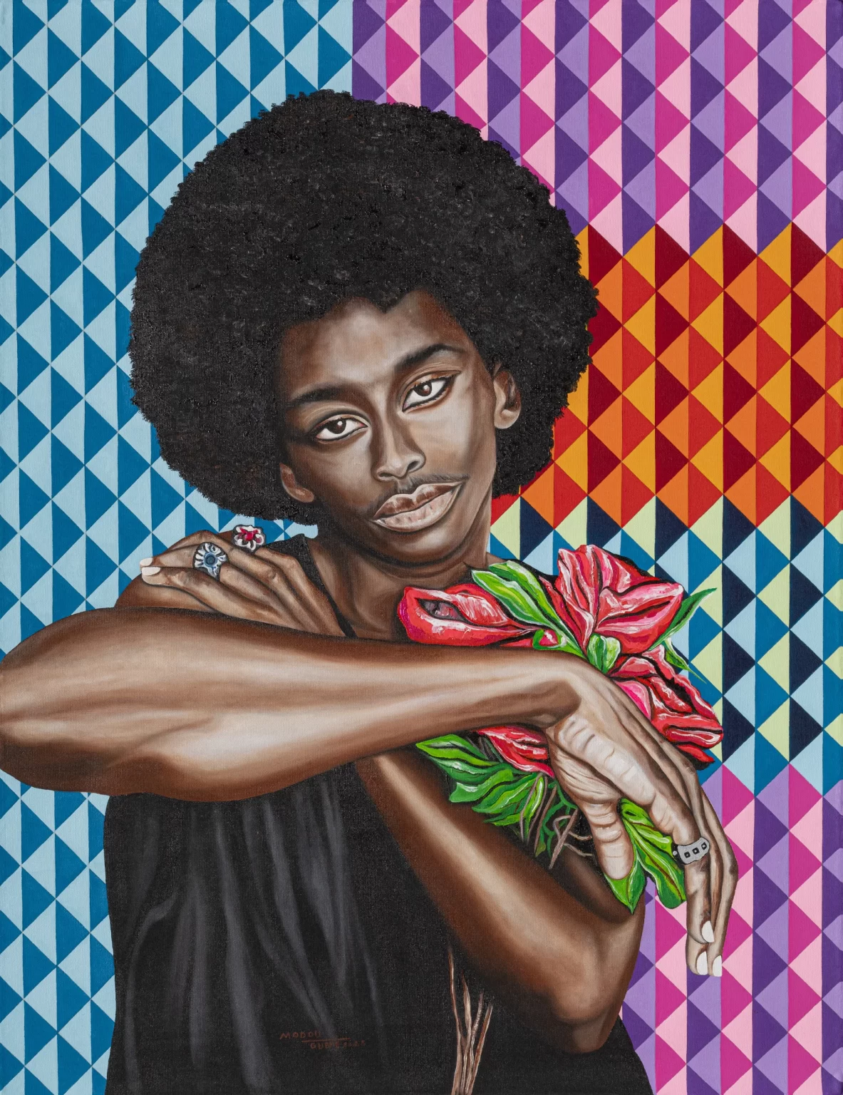 Against vibrant geometric backgrounds that pulse with color, tessellated patterns in orange, purple, yellow, blue his subjects emerge with quiet dignity. A woman holding flowers. Two figures in yellow and purple, their hands gently framing each other's faces. A young girl on a swing, surrounded by the same patterns that might appear on a mat beneath her feet or woven into her hair. The repetition isn't decorative. It's structural, a visual argument that the textures of childhood and the architecture of culture are inseparable.