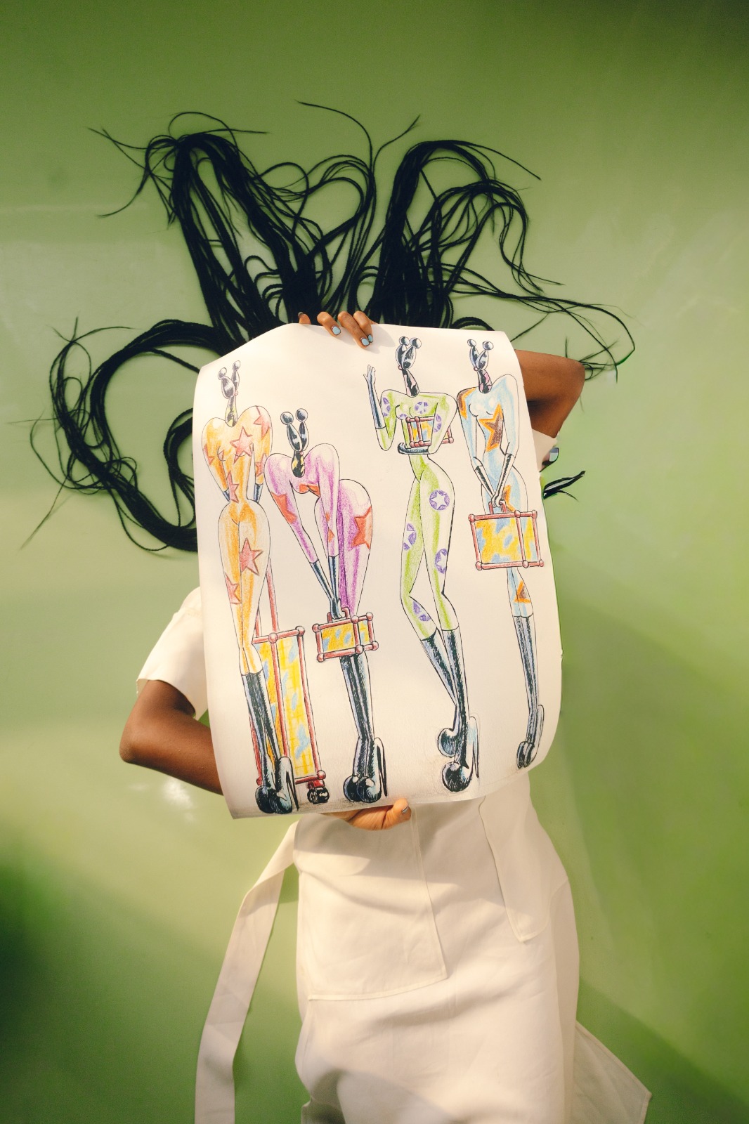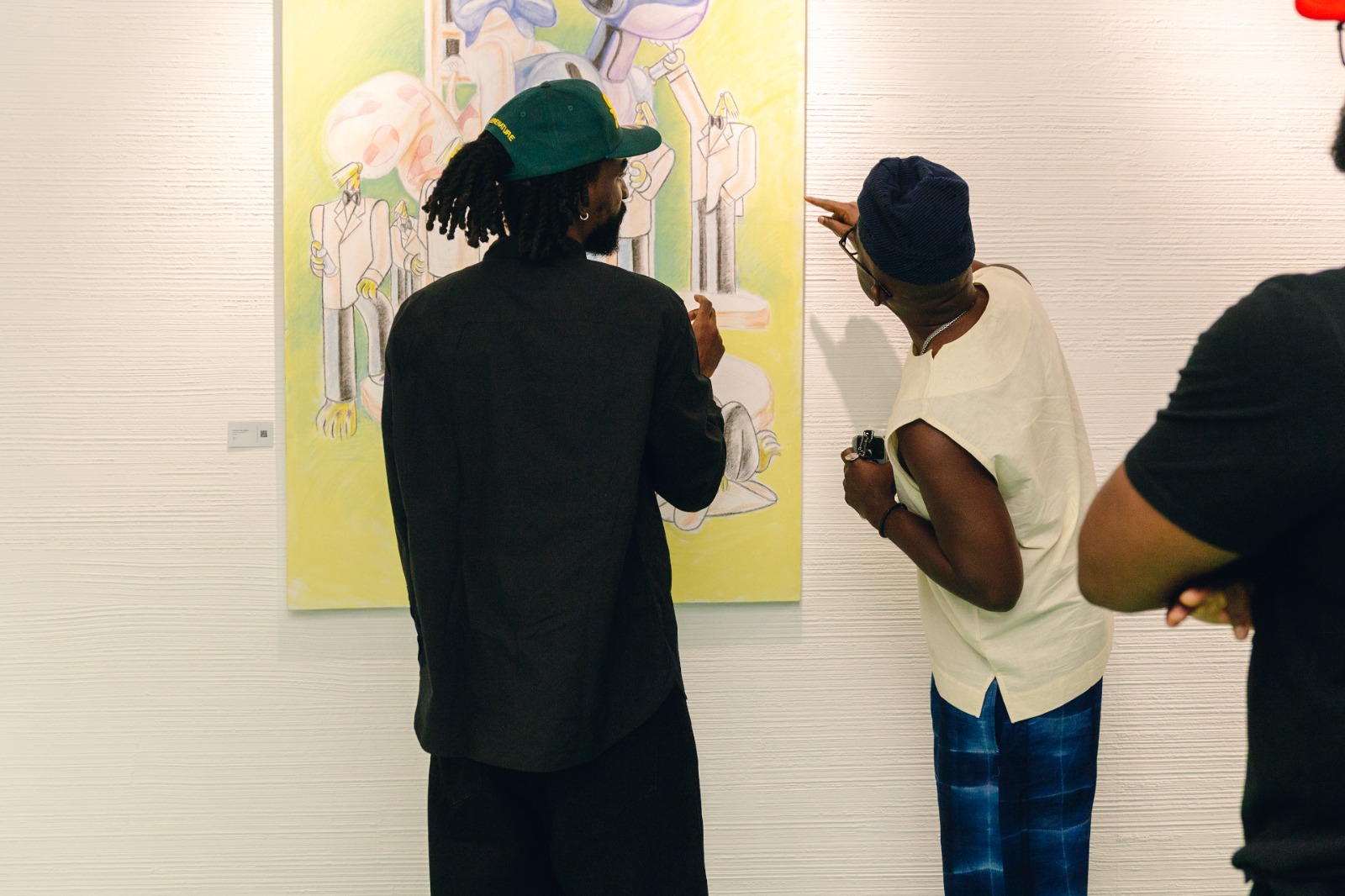Founded by 25-year-old creative director Khadijah Okoya, Nuru Gallery positions itself as "a space for layered African expression", a mission statement that feels less more like a manifesto when you step into the seafoam-green floored space on the fifth floor of Eleganza House. The gallery's concrete ceiling and textured walls create what Okoya describes as an atmosphere of "floating between sky and structure," a deliberately childlike yet sophisticated environment that serves as the perfect canvas for Upson's world-building.