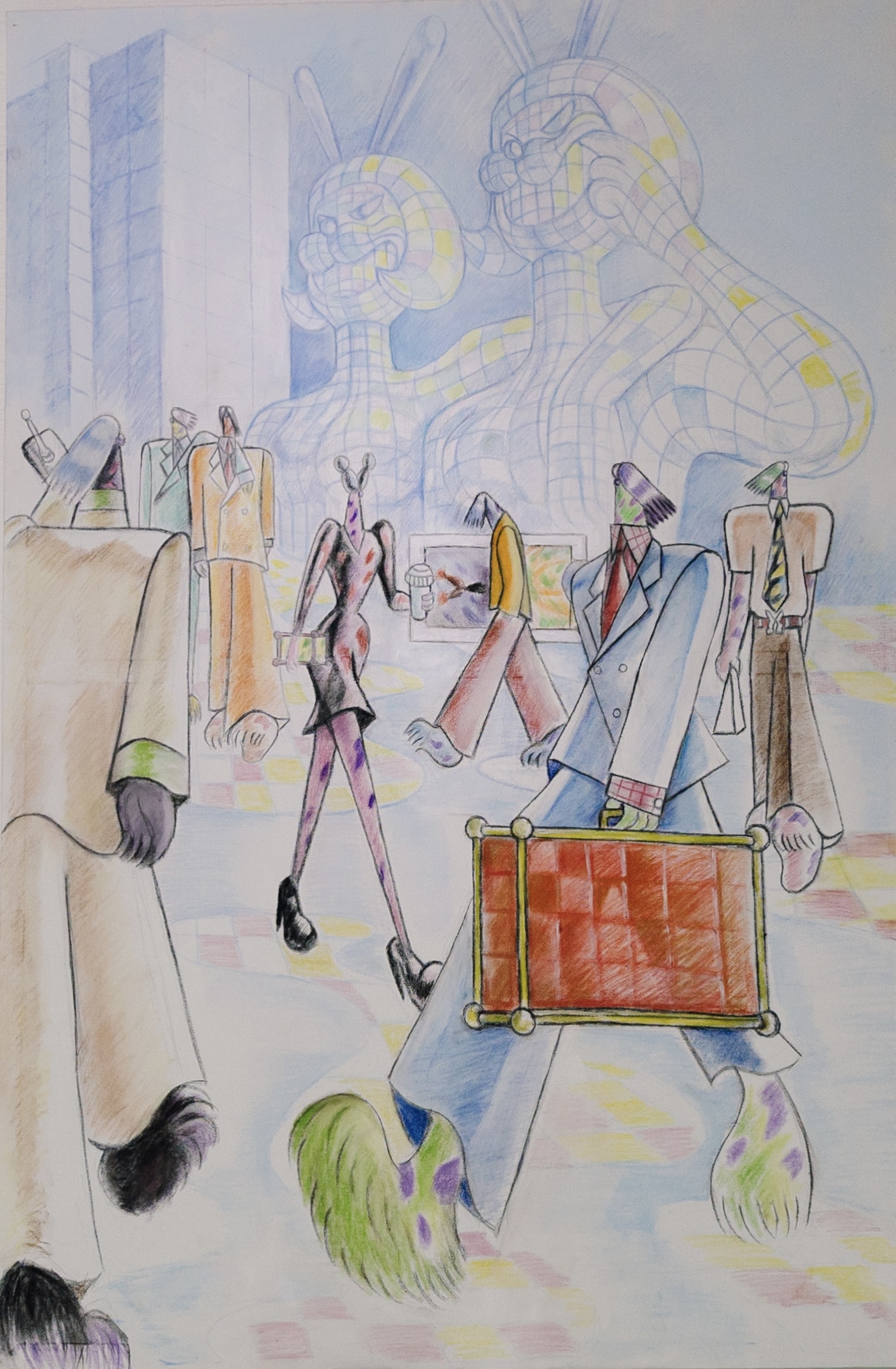 Pinterest, the exhibition's opening salvo, nods to the contemporary artist's digital reference library. Its brawling, energetic characters capture that pre-form moment when ideas still exist in beautiful chaos. District of Financials introduces something more narrative: an imagined Lagos ruled by two omniscient women, populated by characters driven by ambition and self-determination. The journey culminates in Graduation: both symbolic ascension and celebration of the artist's next creative threshold.