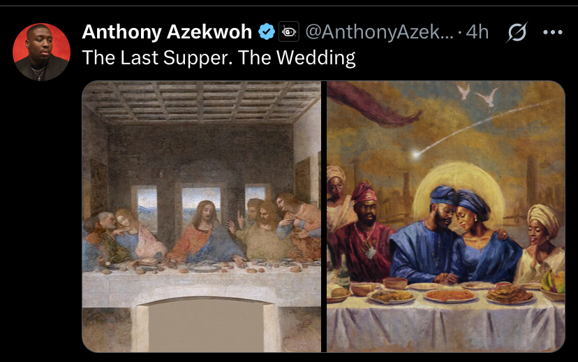Anthony Azekwoh’s The Wedding is a meditation on one of the most important ceremonies in African society. Through surreal figures and well chosen emotional colour palettes, he turns the wedding ceremony into a narrative space where love, tradition, pressure, and performance coexist. In his recent post on twitter, he placed side-by-side, a visual biblical representation of “The Last Supper” with his largest piece painted on the “The wedding” collection. This makes viewers question whether religion was a participating factor in his inspirational process.