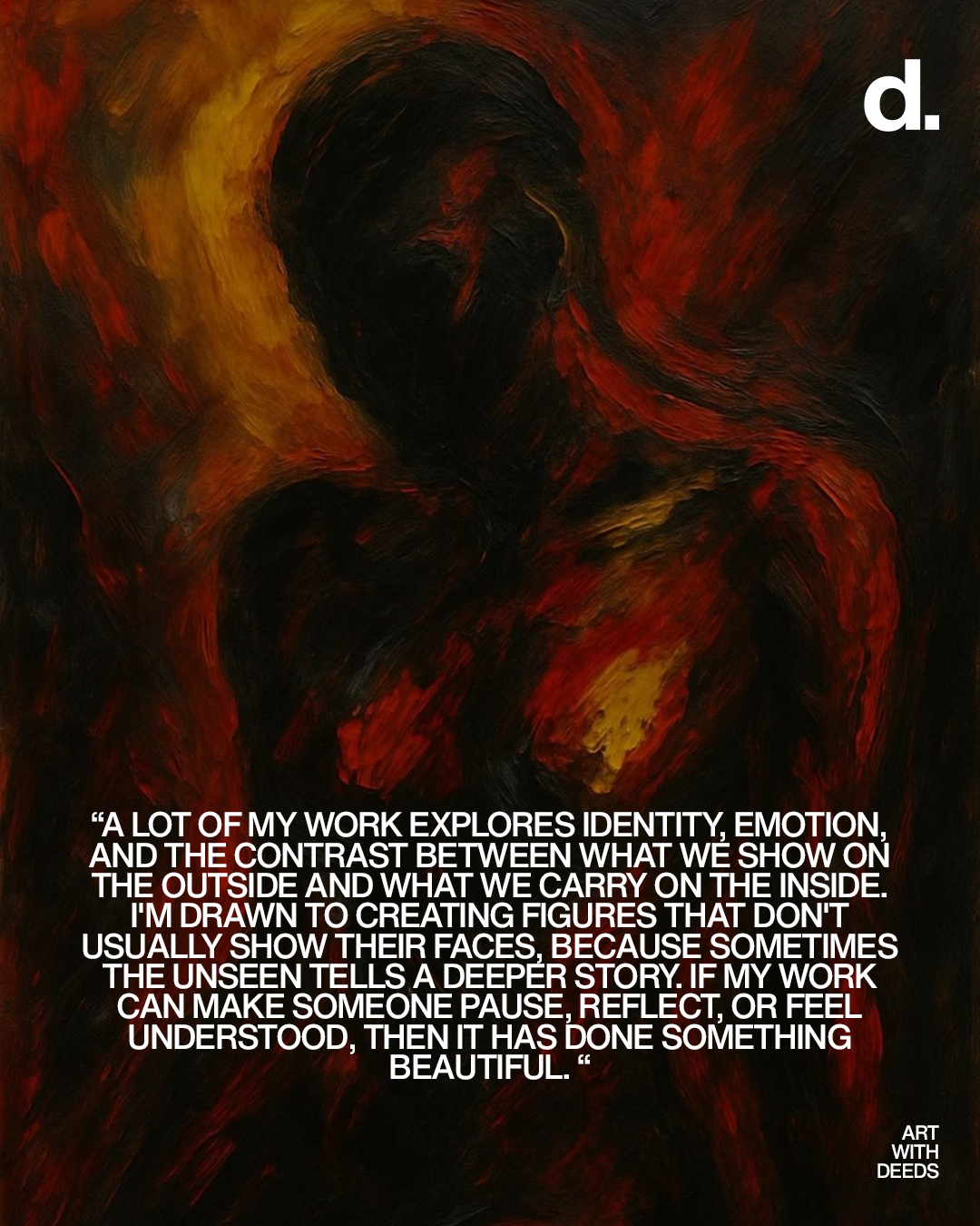 A lot of my work explores identity, emotion, and the contrast between what we show on the outside and what we carry on the inside. I'm drawn to creating figures that don't usually show their faces, because sometimes the unseen tells a deeper story. If my work can make someone pause, reflect, or feel understood, then it has done something beautiful.