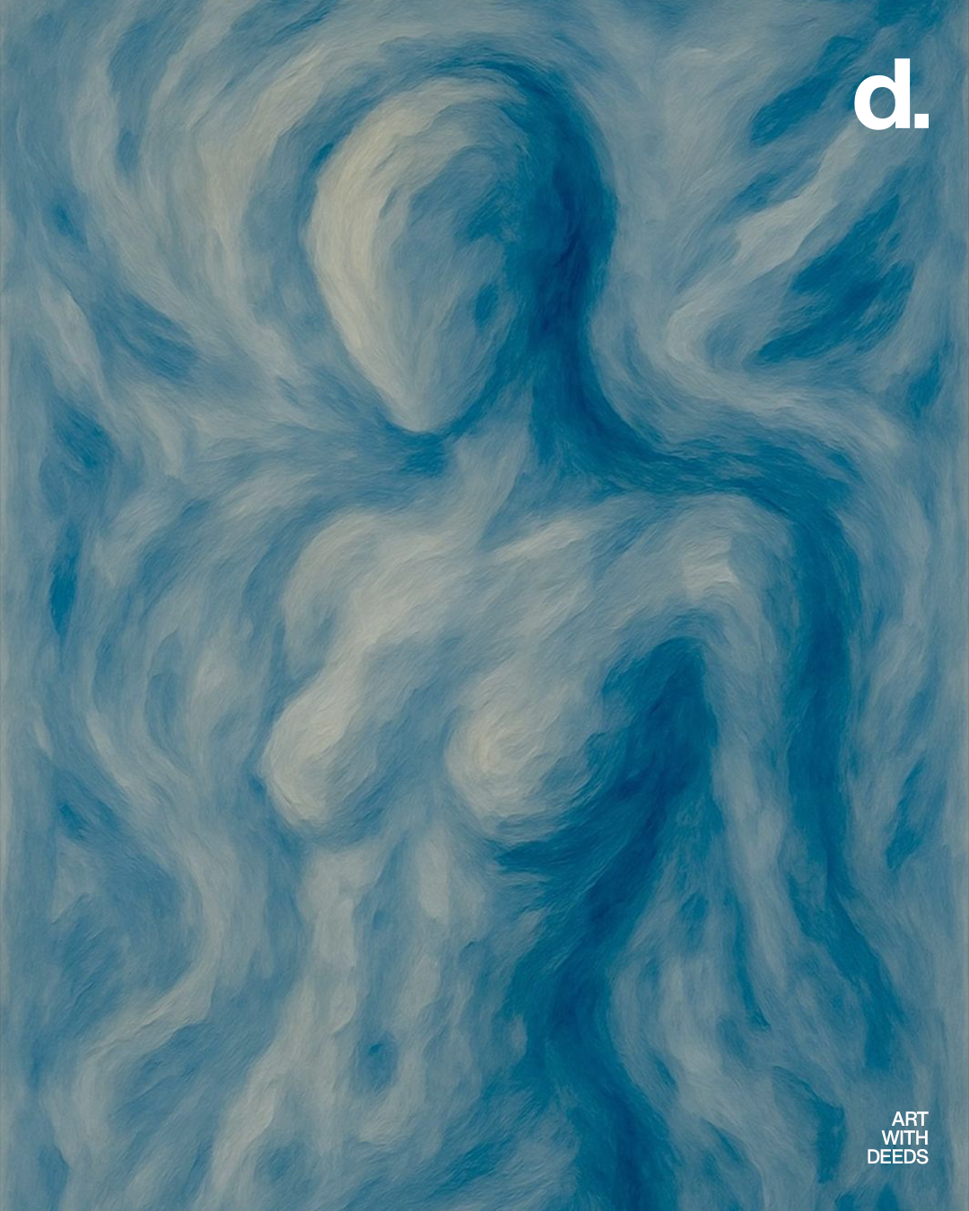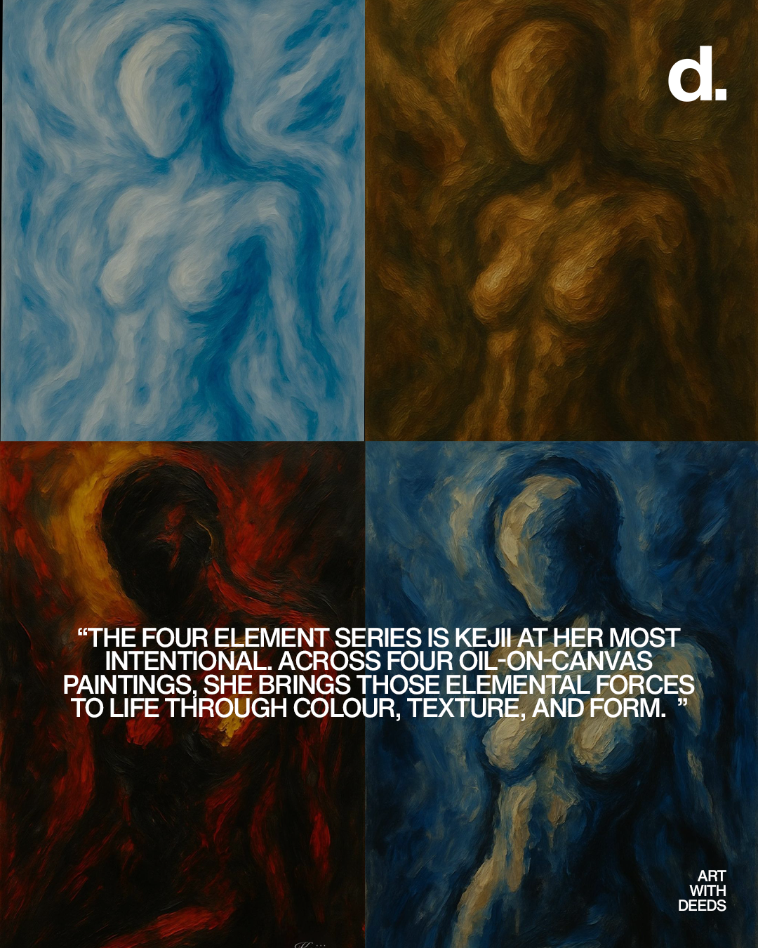 Released on the 6th of October 2025, The Four Element Series is Kejii at her most intentional. Across four oil-on-canvas paintings, she brings those elemental forces to life through colour, texture, and form. Fire emerges in deep reds, oranges, and blackened shadows — the figure appears forged rather than consumed. Earth shifts the palette to ochres and browns, the silhouette heavy and grounded. The brushwork feels almost sculptural, as though the figure was carved from the land itself. Air is the lightest of the series, rendered in swirling blues touched with gold. The figure drifts at the edges, loosening, refusing containment. It does not dominate the canvas; it shares the space. And water flows in cool blues and soft whites, the silhouette surrendering into constant motion, blurring the line between body and environment. Notably, each figure takes the feminine form, Mother Nature embodied. The work is quietly stunning, asking not for attention but for stillness.