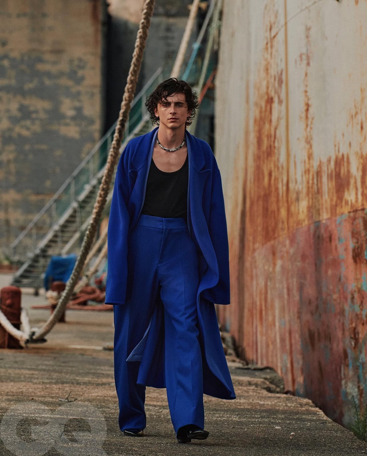 First, he commands the frame in an oversized electric blue coat pair with trousers. It is draped over a working-class black tank top and set against a rusted industrial wall. The silhouette is regal yet rough. It suggests that true luxury does not need a pristine background because it shines brightest in the dirt.