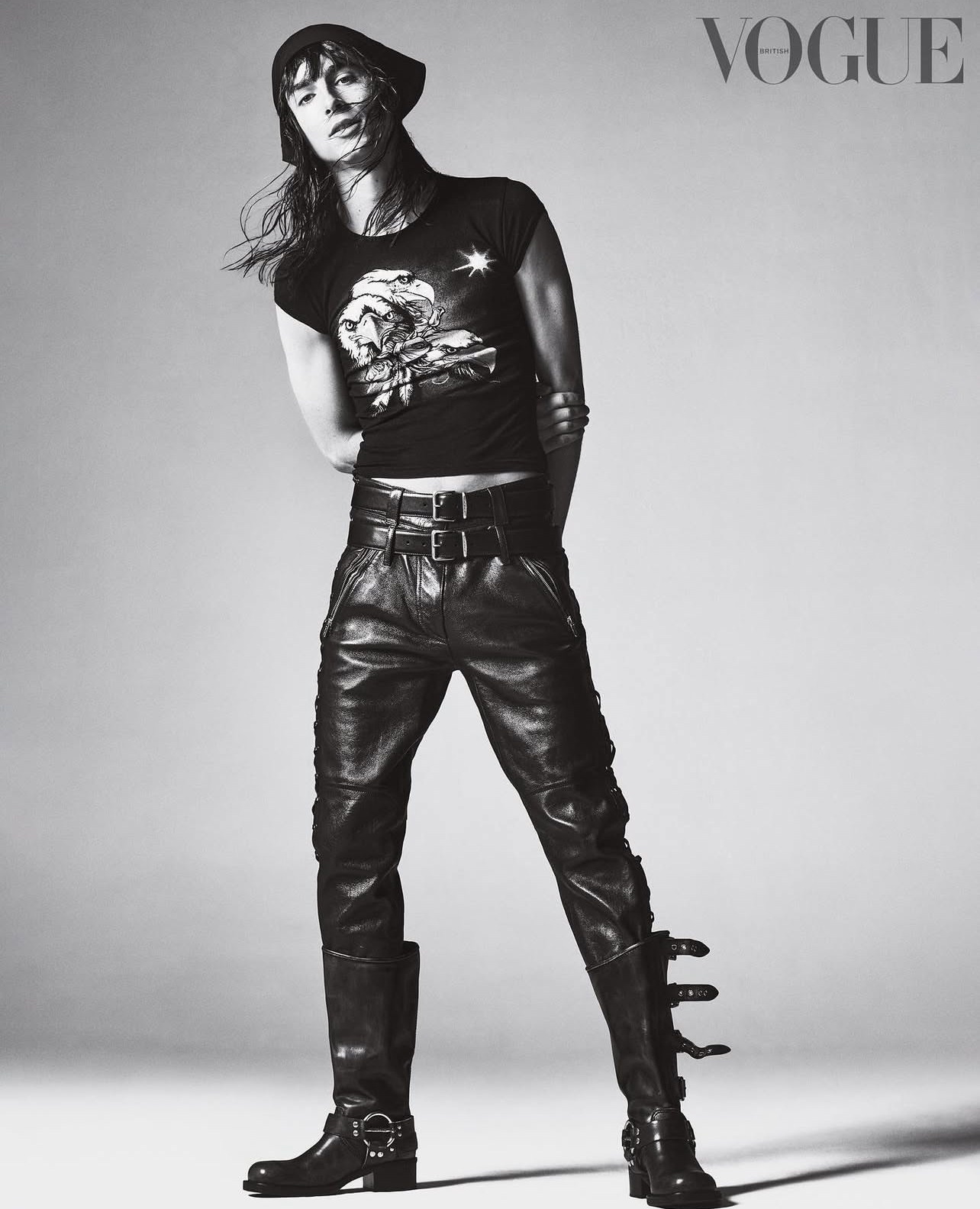 To understand where we are today, we must acknowledge the moment the shift began. While this look features leather biker trousers, moto boots, and a crop top, it is actually from his historic October 2022 British Vogue cover.