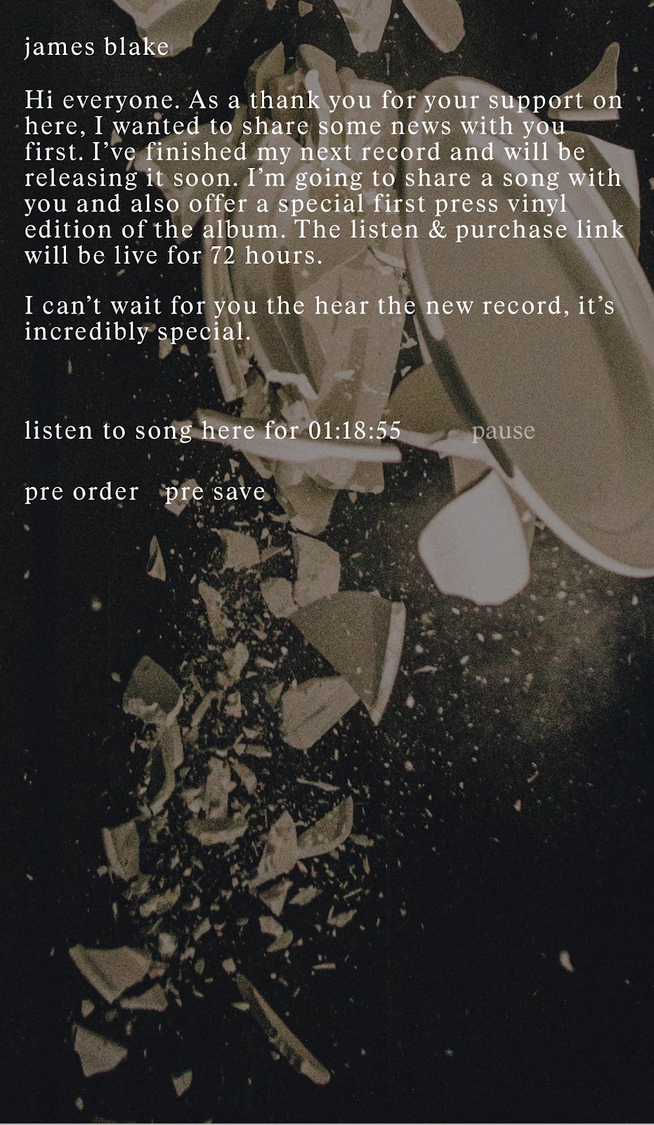 He committed himself and his art to independence, fostering direct, genuine fan engagement and promotion. In the spirit of maintaining agency of his own fan relations and promo, James Blake released this exclusive track with Dave on Monday, January 19th, with a 72-hour listening window with options to preorder or presave, in addition to offering a special first press vinyl edition available for purchase.