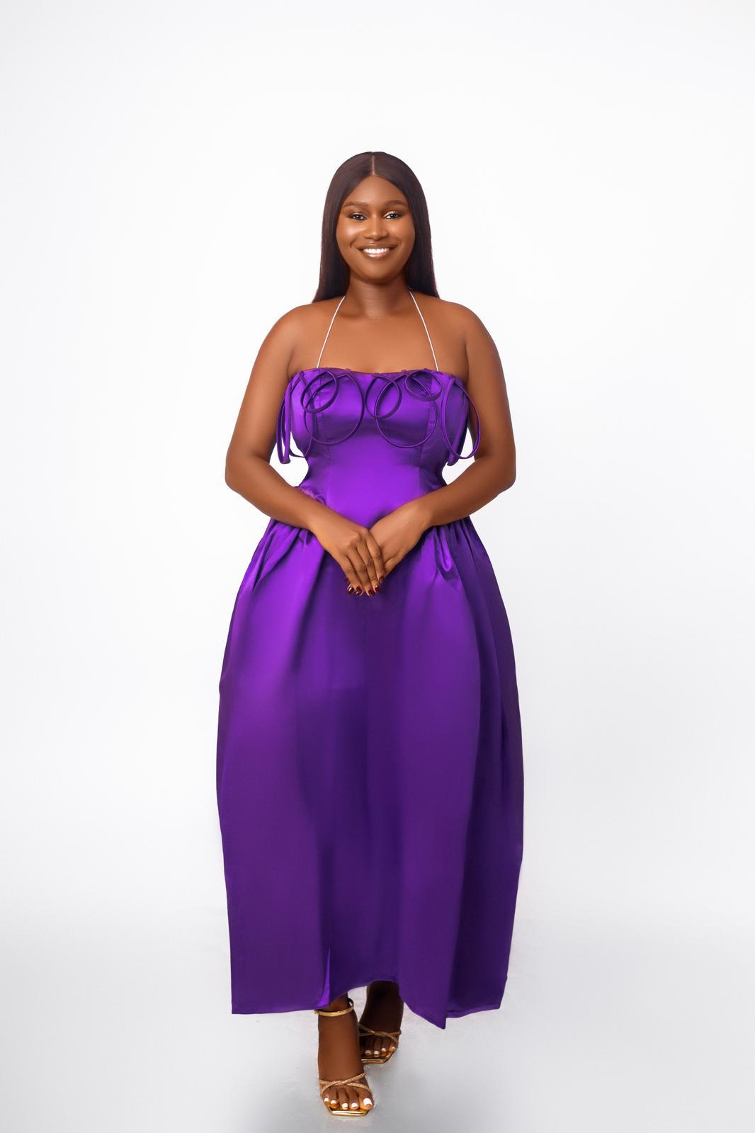 The collection moves through five dresses in crimson, royal blue, purple, gold, and emerald green. All bold, all saturated, and, on the lookbook evidence, all extraordinary on dark skin. Every colour pops against melanin in a way that reads as deliberate rather than coincidental. When asked whether designing the palette around melanin-rich tones was a conscious starting point, Osi’s answer is nuanced. “The colour story was very intentional,” she says. “We chose tones that felt rich, elevated, and expressive. But we did not build the collection with only one skin tone in mind. At St. Nuella, versatility and inclusivity are very important. We design with a broader view, across different skin tones, body shapes, and sizes.”