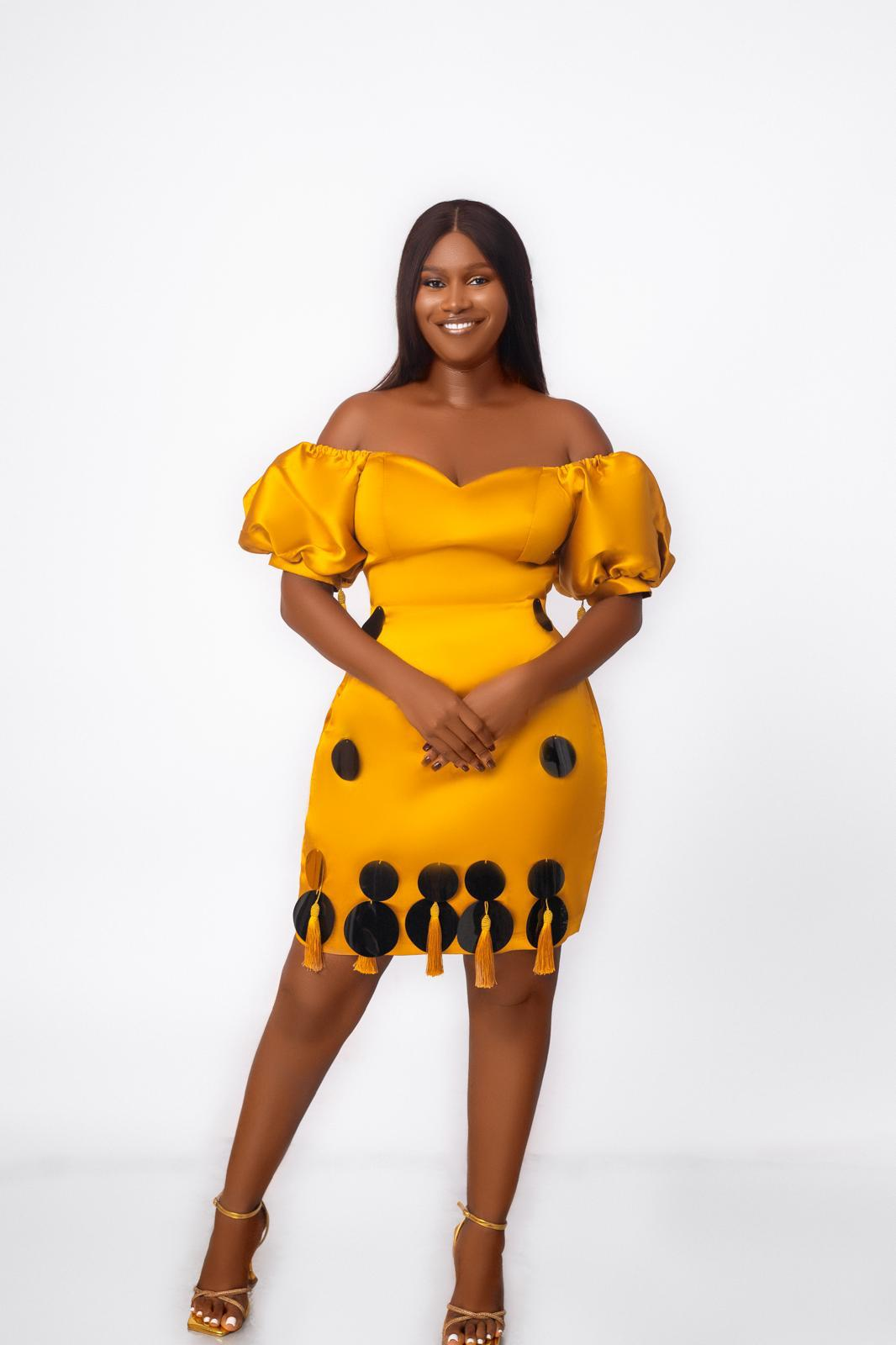 The gold dress shifts register. Off-shoulder with soft balloon puff sleeves, a sweetheart neckline, and a bodycon fit through the hip. The talking point is the hemline: black circular disc appliqués with gold tassels hanging from them, creating movement and a graphic black-on-gold contrast. This is the most event ready piece in the collection, the one that photographs well in dim light.