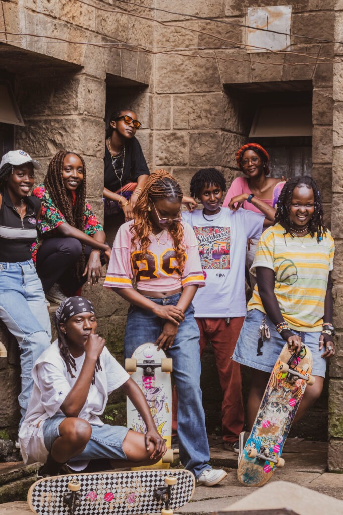 Having caught the attention of VOGUE, the Olympics, and Jordan with their work over the years, GirlSkate’s growing numbers have allowed their vision to follow suit. What are now known as Skate Jams paved the way, allowing aspiring DJs of any gender or skill level to play as skaters and skate enthusiasts hone their skills or catch a vibe. Dressed in popular, homegrown streetwear brands like Studio18 and PE$OS Nairobi, skate skills aren’t the only things expressed against the backdrop of the city’s skyline. Regional collaborations with Rwanda’s Fragile, Uganda-based Tutaabale, and skate shop Skating is Risky! have continued fashion and skating’s affair across borders, with equipment and funding flowing into the community as well.