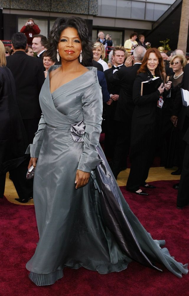 Attending as a presenter, Winfrey chose a sculptural off-shoulder blue-gray Gianfranco Ferré gown. The look reflected the early-2000s preference for refined couture silhouettes over overt embellishment.