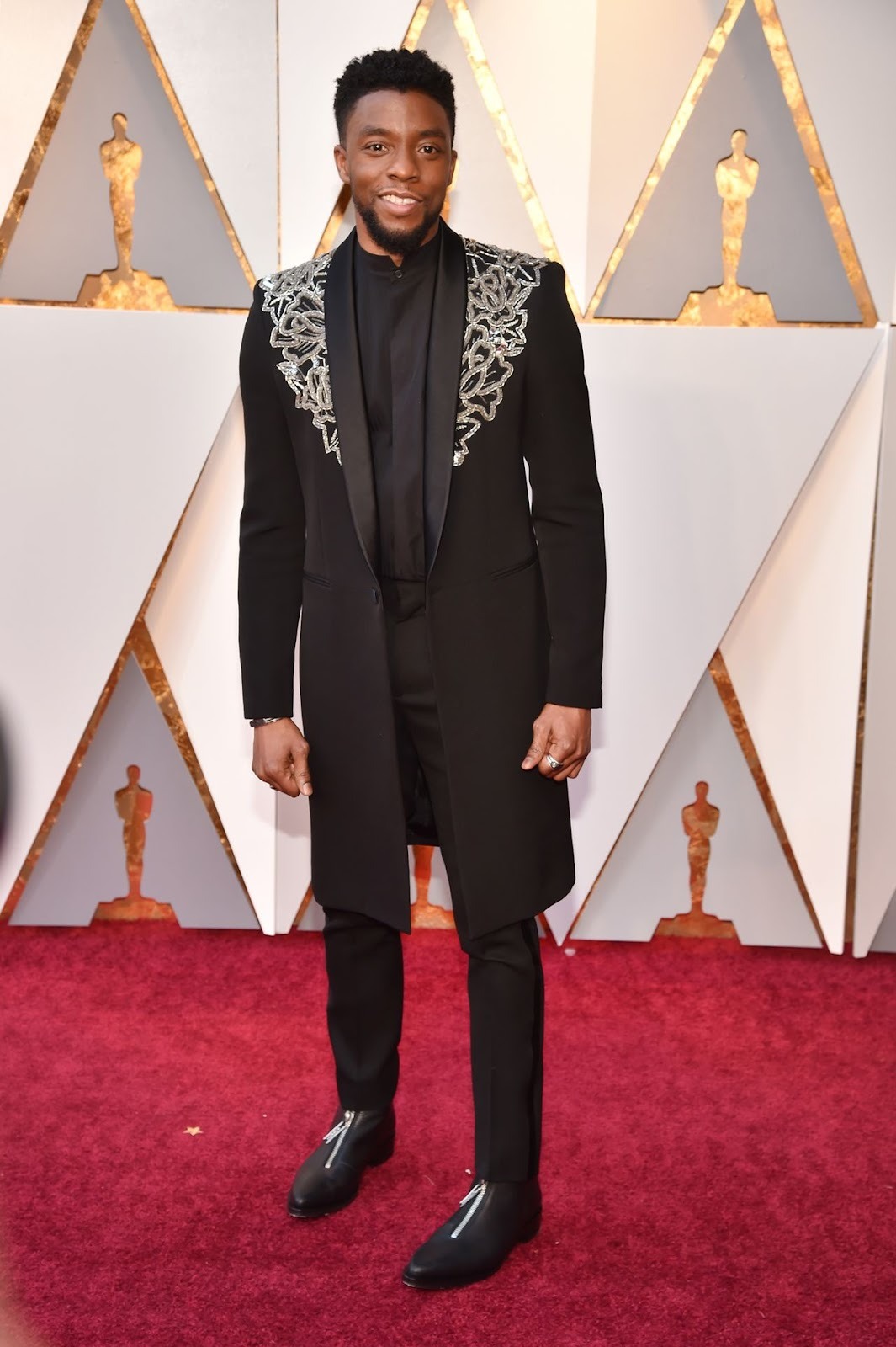 Presenting during the cultural peak of Black Panther, Chadwick Boseman challenged the uniformity of men’s formalwear. His embroidered Givenchy topcoat brought personality and cultural symbolism to the Oscars carpet.