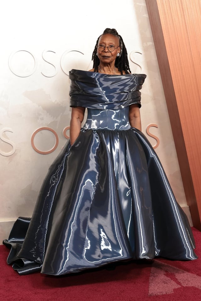 Whoopi Goldberg in a blue 'liquid water' organza gown by Christian Siriano illustrated Siriano’s continued influence on contemporary red-carpet couture.