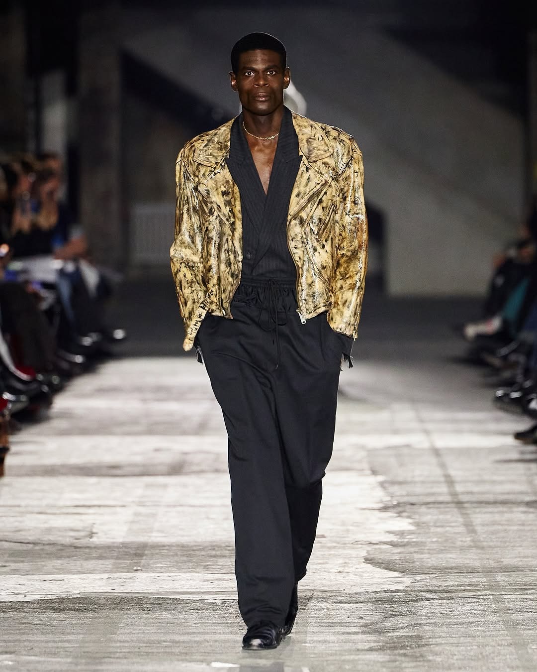 The opening look set the tone of the collection. A distressed leather biker jacket, treated over 28 hours with sandpaper, red soil, paint and varnish paired with a reversed suit jacket, deconstructed and reassembled with raw seams exposed on the exterior, and “boda boda” chinos which replaced traditional waistbands with one made from track offcuts.