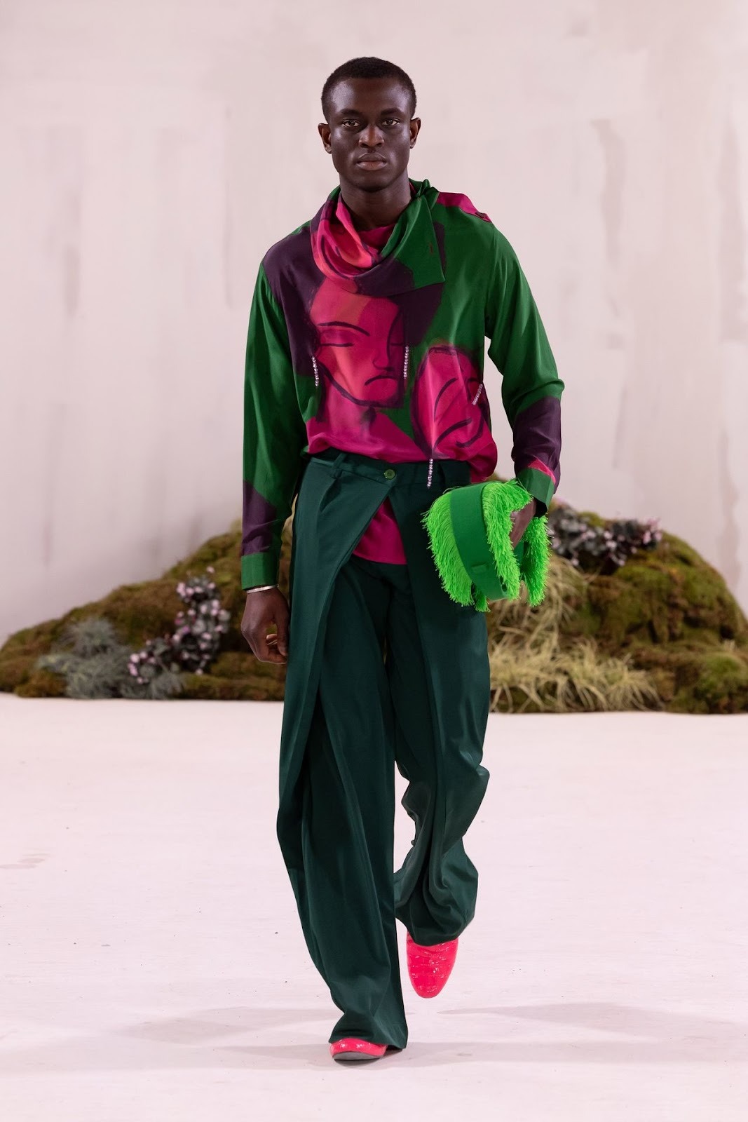 Colour remained the collection’s most immediate strength. Custom textile, developed in collaboration with artist Sisiano Paolo, ran through the collection. Saturation and print layering created visual warmth, while flowing cuts sustained Orange Culture’s rejection of rigid tailoring conventions. Handwoven techniques were also seen across the collection, and handcrafted, fringed-edge bags created with Lagos brand Kisara added texture and tactility, tying the looks together.